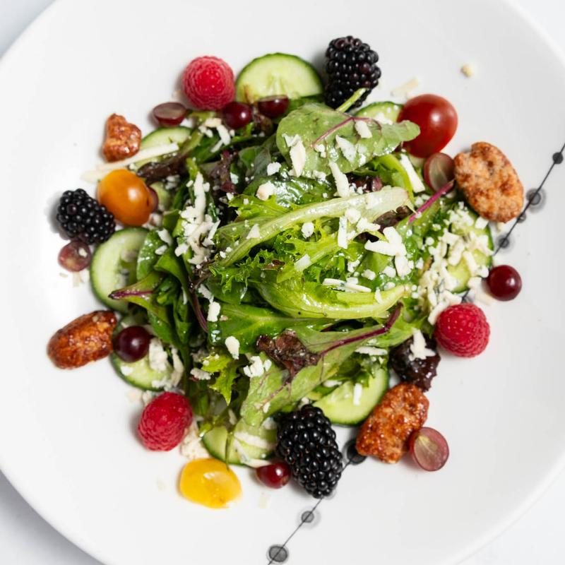Greens, cucumbers, grapes, gorgonzola, raspberries, blackberry, pecans, shallot vinaigrette